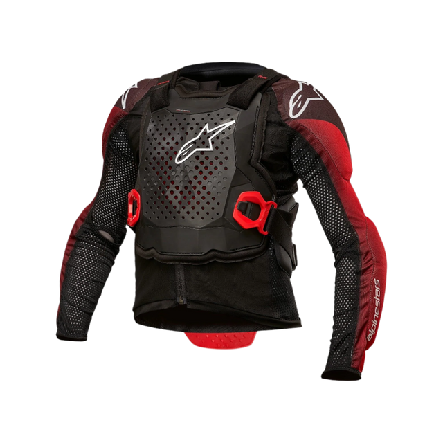 De borst- en rugbeschermers worden stevig op hun plaats gehouden via verstelbare schouderbanden. De onderste bevestiging wordt uitgevoerd via de gemakkelijk te verbinden gespen en V-banden die ook de ribbeschermers op hun plaats houden. De V-banden verspreiden de aanspanningskracht over een groter gebied van de rugbeschermer, wat resulteert in een veiligere en comfortabelere pasvorm. De ribbeschermers bieden extra dekking op kritieke gebieden.