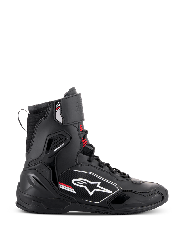 Schoenachtig comfort met laarsachtige bescherming, de Superfaster Tech Riding Shoes zijn ongeveer 25 cm hoog, wat de rijder een betere algehele dekking biedt en, belangrijker nog, meer geavanceerde bescherming omvat, zoals de geïntegreerde lagere scheenbeenbeschermers en het nieuwe, semi-rigide interne enkelbrace-systeem met malleolus impactbescherming en een Achillespeesbescherming. Extra bescherming op het bovenste gedeelte van de Superfaster wordt geboden door dubbel geïnjecteerde enkelplaten, laterale TPR-panelen op de buitenenkel, een versterkte TPU-hielkap en een TPR-gevoerde teendoos met laterale teensliderversterking. De zool zelf beschikt over het Alpinestars TPF transversale beschermingsframe-middenzool, die bestaat uit verschillende lagen bescherming om te voorkomen dat de voet in de verkeerde richting buigt of draait, terwijl het tegelijkertijd zachte PU-schuim, een EVA-hielkussen en een verwijderbare en ademende OrthoLite®-binnenzool bevat.