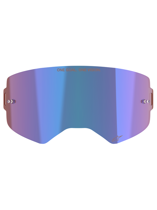 Alpinestars Supertech Mirror Lens, vervangingslens voor motorcrossbril, spiegelblauw met paarse iriserende afwerking, voorzien van geïntegreerde tear-off pinnen, "ONE GOAL. ONE VISION." tekst aan de bovenkant en Alpinestars-logo aan de onderkant, helder polycarbonaat voor off-road racen