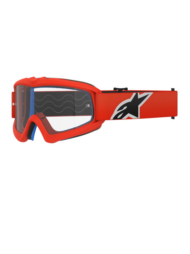 Alpinestars Vision Youth Corp Goggles, jeugd motorcrossbril, oranje frame en heldere lens, oranje band met opvallend zwart en wit Alpinestars-logo, zichtbaar blauw gezichtsschuim, siliconen grip-golven, polycarbonaat anti-condens lens voor off-road racing